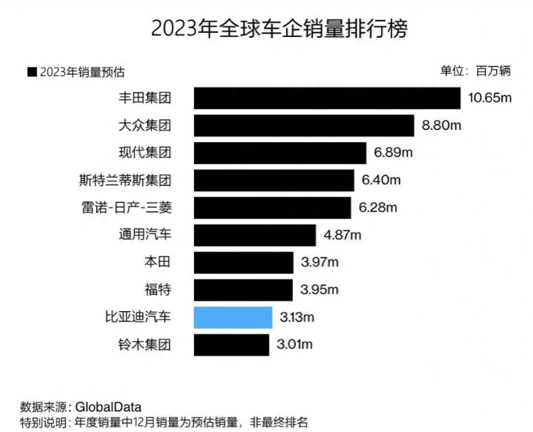 2023年的全球汽车销量排行榜出来了,国内最强的比亚迪仅仅排行第九位,而丰田汽车仍然以超过1000万辆的成绩傲居第一名。