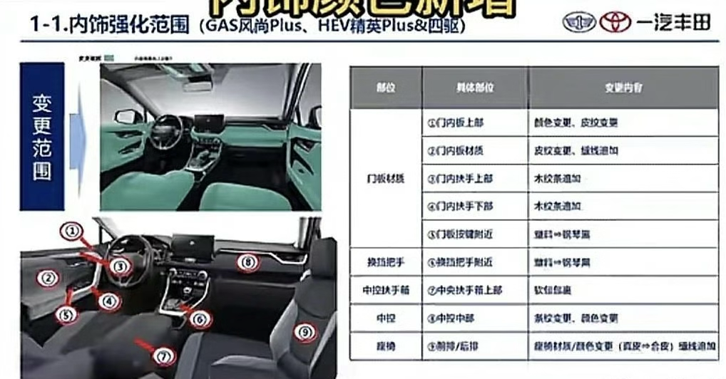 内饰的变化共有9个小细节,主要包括门板的材质上增加了一些木纹饰板,换挡把手、中控、座椅的颜色和皮纹也都做了不同程度的调整。整体会更有质感,舒适度也有提升。