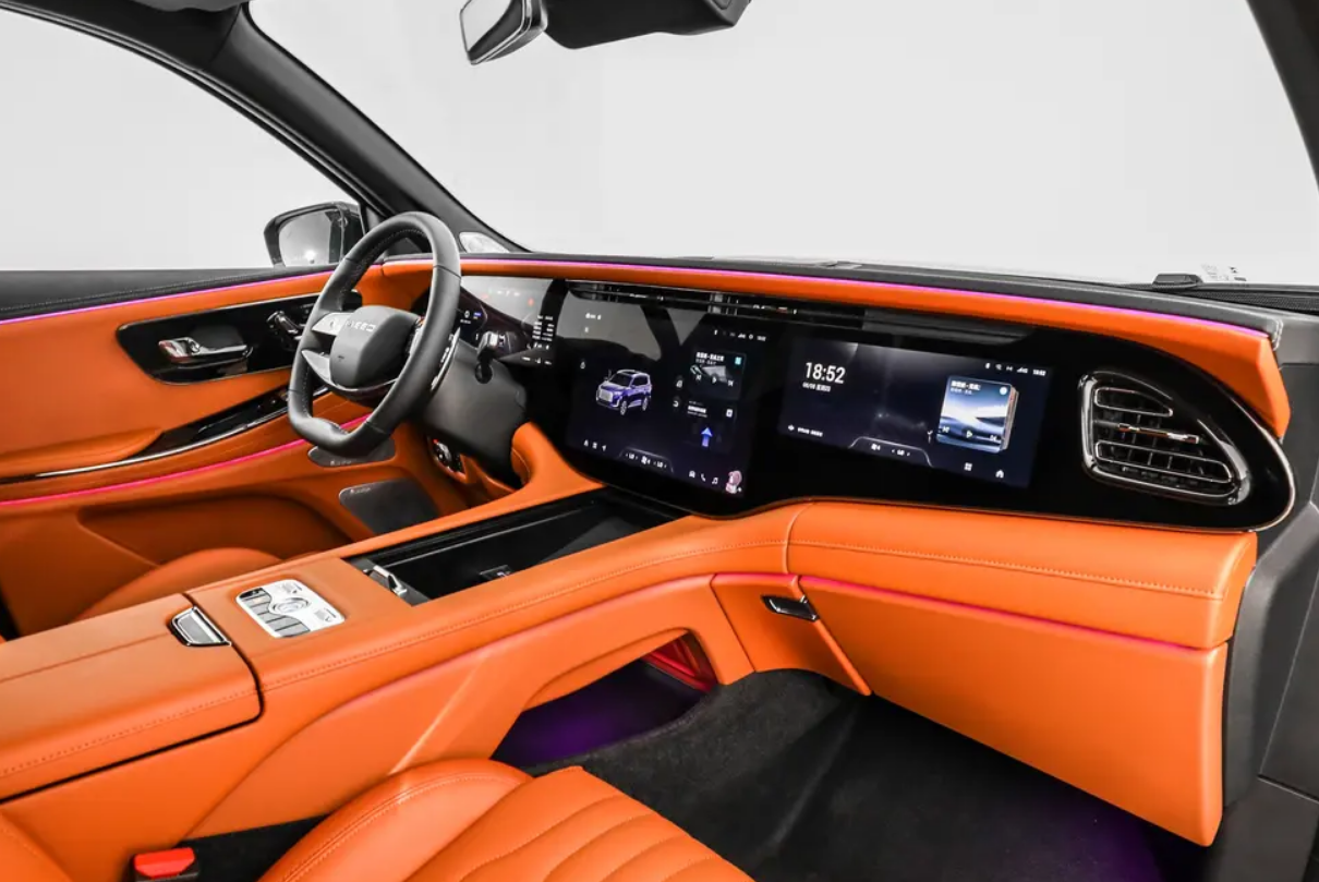 进到车里,我觉得揽月的内饰真的很有科技感。最吸引我的就是那三块大屏幕,包括全液晶仪表盘、中控屏和副驾驶屏幕。基本上所有功能都能通过屏幕操作,实体按键很少,看着特别简洁大气。 座椅方面也很贴心,有 5/6/7 座可选,还有个叫“女王副驾”的功能,据说是专门为女性乘客设计的。前排座椅还带电动按摩、加热通风功能,坐着肯定很舒服。 配置方面也是应有尽有,像自动空调、车载空气净化、PM2.5 过滤、车内香薰这些都有。还有 CarPlay、语音控制、手势控制、5G 网络、OTA 升级等智能化功能。最让我惊喜的是全系标配了索尼音响,顶配版甚至有 23 个扬声器,听音乐肯定很爽。
