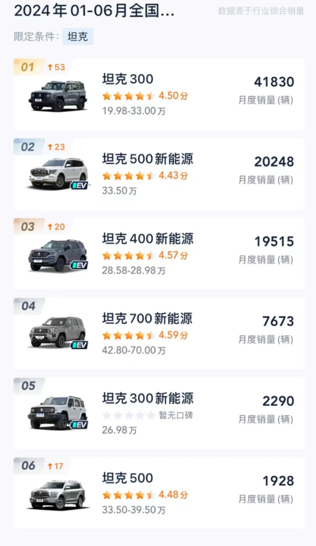 从数据来看,如果论单车依旧是坦克300遥遥领先,但把上半年累计超过2万的坦克500混动、接近2万的坦克400混动,还有超过7千的坦克700混动加在一起,新能源已经成为了坦克品牌的销量主力,而且从价格来看,反而是混动家族要远远高于燃油版的坦克300。