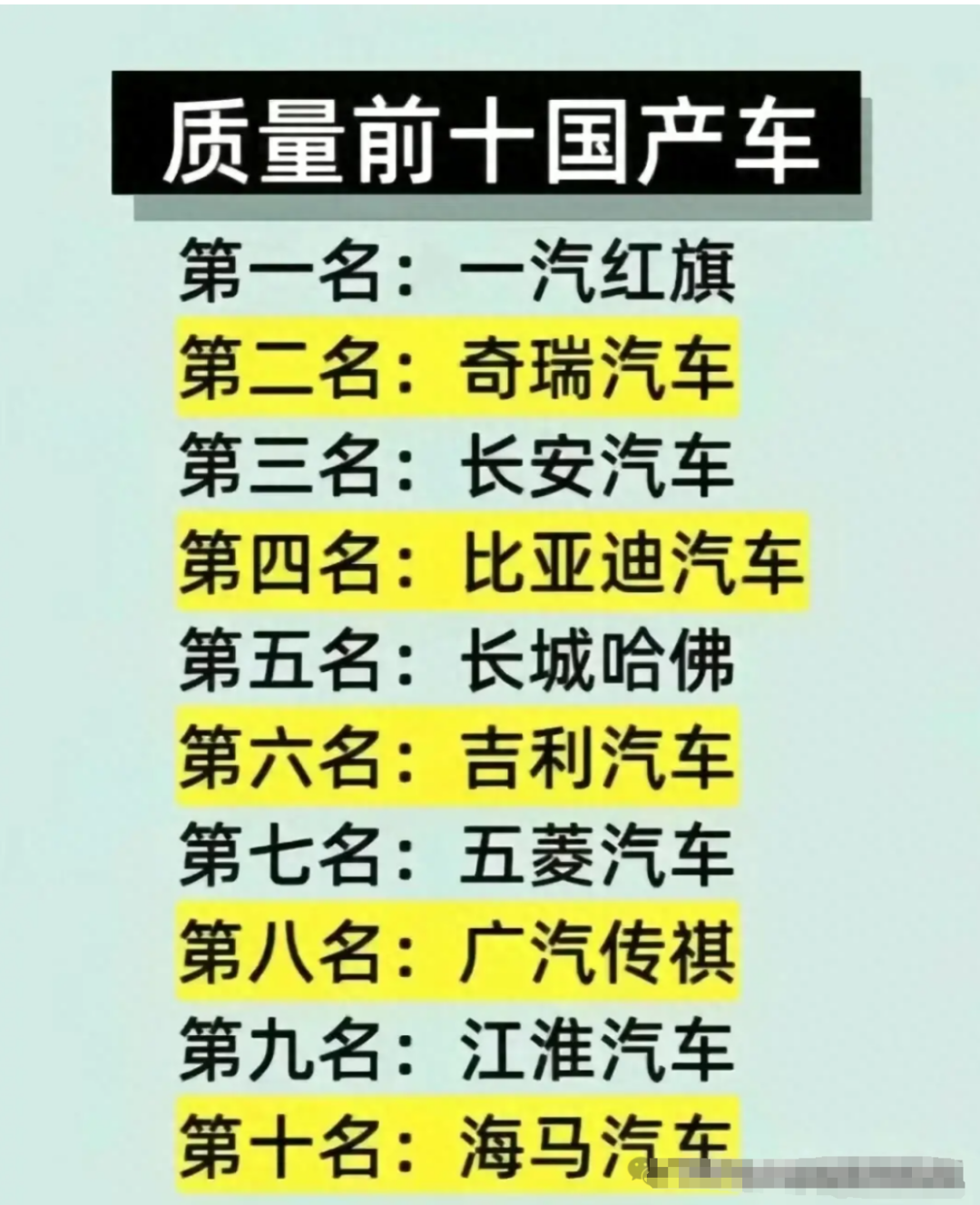 下面小编看下这张网友统计的国产车质量排名,你赞同吗?