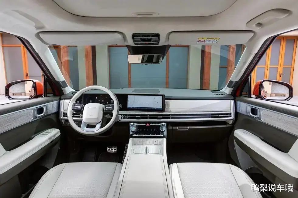 车内用用触摸到的地方大多采用皮质包覆,空调出风口处和门板还采用木纹饰板进行点缀,与贯穿式氛围灯烘托出硬朗且高级的视觉感受。中控台搭载了双12.3英寸的曲面液晶屏和10英寸的HUD抬头显示系统。下方中控区域还保留了部分实体按键,提升科技感的同时也提升了便利度。