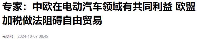 以上信息来源:光明网2024-10-07——专家:中欧在电动汽车领域有共同利益 欧盟加税做法阻碍自由贸易