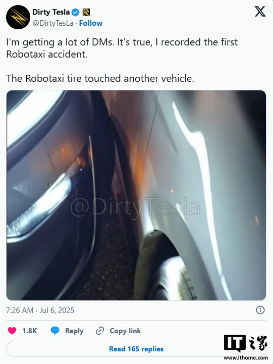 IT之家7月7日消息,当地时间7月4日,特斯拉备受瞩目的纯视觉Robotaxi自动驾驶出租车项目迎来了其首次碰撞事故。