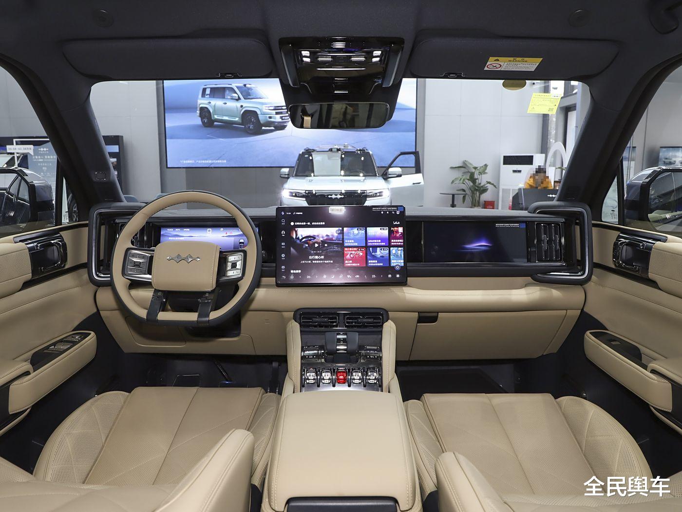 走进车内,方程豹豹 5(B5)的内饰设计基于 “锁扣” 理念,象征着链接、独特、力量与安全,与外观设计相呼应。中控台部分共搭载了三块屏幕,中央是一块 15.6 英寸 2.5K 高清中控多媒体屏,主驾采用 12.3 英寸仪表屏,副驾位置搭载 12.3 英寸多媒体娱乐屏,带来丰富的信息显示与便捷的操作体验。车门两边采用锁环式扶手及锁环式门扣设计,上车拉手与空调出风口融为一体,独特且实用。中央通道部分拥有可滑动扶手,科技感与个性化十足。方向盘采用 4 幅镂空设计,在保证硬派风格的同时实现了轻量化。中控台采用可升降换挡挡杆,车辆启动时换挡杆升起,关闭时缓缓回落,充满仪式感。挡杆前方设有最高 50w 无线快充,下部一排水晶透明按键以现代工业风呈现,兼具美感与实用性,前后差速锁采用较大尺寸的实体按键,方便冬季戴手套操作。车内还配备了法国高端音响品牌帝瓦雷的音响系统,至高搭载 18 个扬声器并附带主驾头枕扬声器,打造超凡的立体声效果。车载冷暖冰箱、主动式香氛系统、多色内饰氛围灯以及电动开闭全景天窗等配置,进一步提升了驾乘的舒适体验。