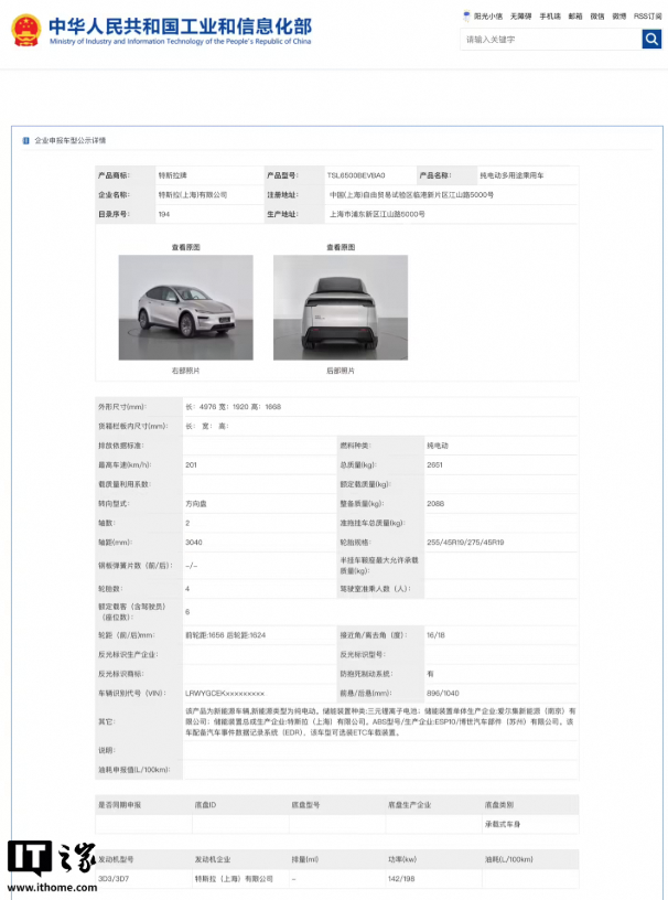 IT之家从工信部今天发布的第 397 批《道路机动车辆生产企业及产品公告》新产品公示中也发现了 Model Y L 的信息。新车长宽高分别为 4976/1920/1668mm,轴距 3040mm,整备质量 2088kg,总质量 2651kg。