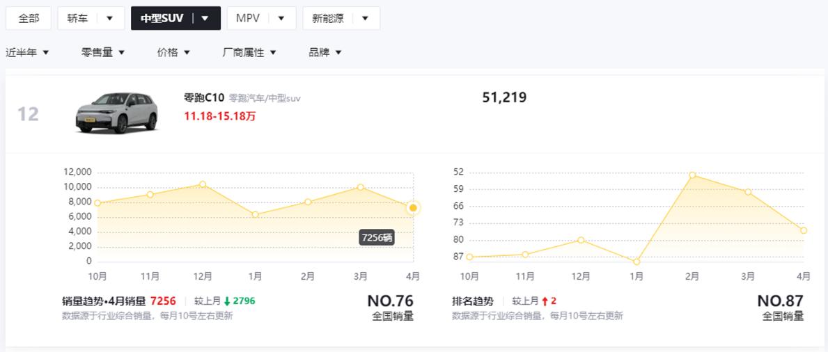 C11和C10是零跑汽车的主力车型,主打性价比,其中C10在4月售出7256辆,近半年累计销售51219辆,位列中型SUV 近半年销量排行榜第12位,同级别的竞争对手有比亚迪宋L DM、长安深蓝S07、奇瑞风云T9等车型。本次C10改款各方面的产品力均得到增强,售价还进行了下调,未来能否助力销量进一步增长,我们拭目以待。