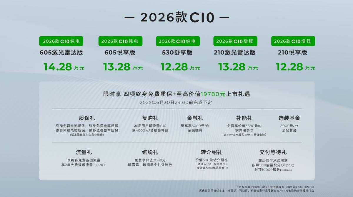 零跑汽车2026款C10正式上市,新车提供纯电版和增程版车型可选,纯电版指导价12.28万-14.28万元,增程版指导价12.28万-13.28万元,与2024款C10(指导价12.88万-16.88万元)相比,整体售价有明显下调,同时三电性能、舒适配置、驾驶质感均有提升,主打一个降价增配。