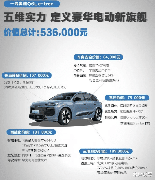 近期一汽奥迪旗下的Q6L e-tron正式迎来了上市,厂家给用户算了一笔账,就是将各项配置进行了叠加,得出的结论是新车总价值53.6万元,但你知道吗?真正预售后,这款新车给出的价格为35.3万元以及38.3万元,没想到一家车企还能如此算账。到底是真划算,还是性价比一般呢?一起来了解一下。