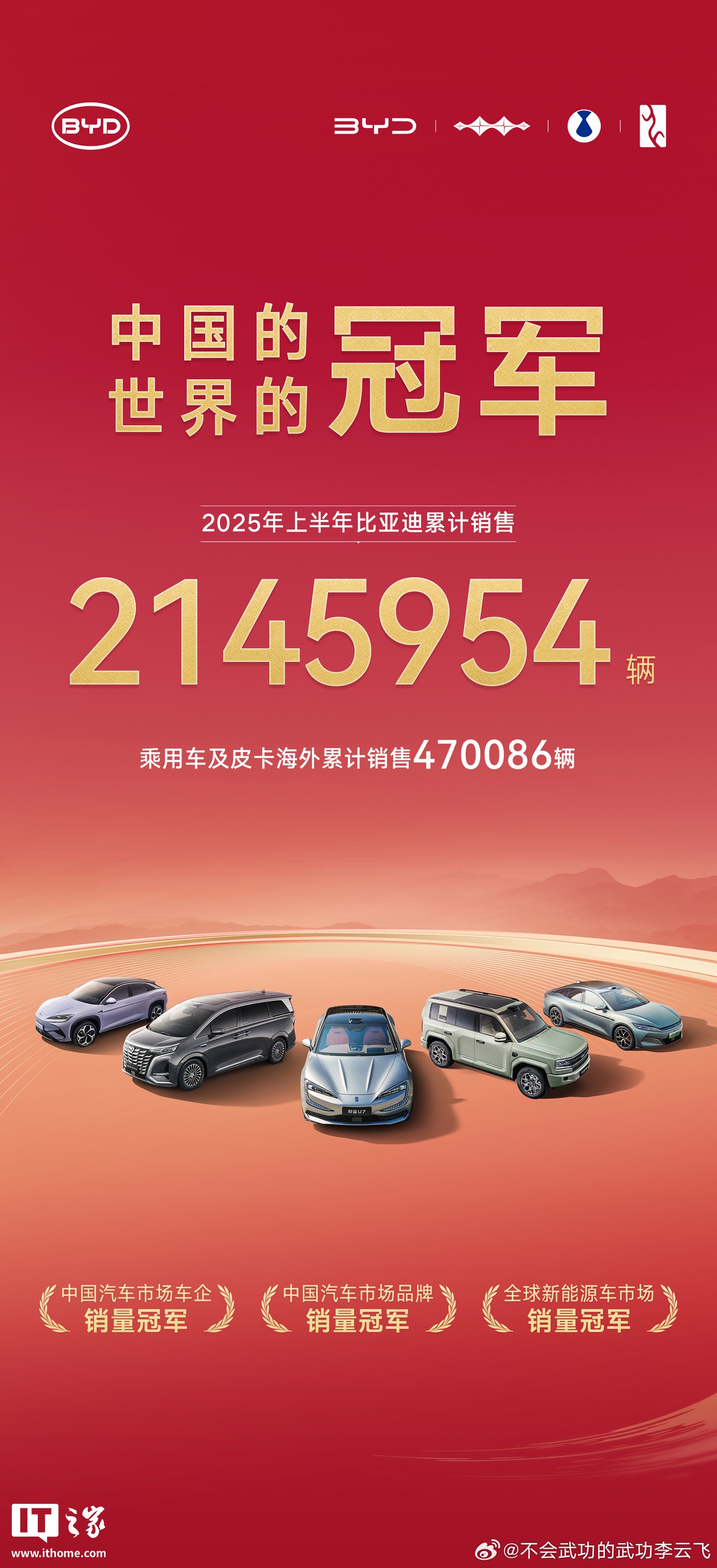 IT之家7月30日消息,比亚迪集团-品牌及公关处总经理李云飞今日发文宣布,比亚迪2025年上半年累计销售2,145,954辆,蝉联中国市场车企、品牌销量冠军,蝉联全球新能源汽车市场销量冠军。