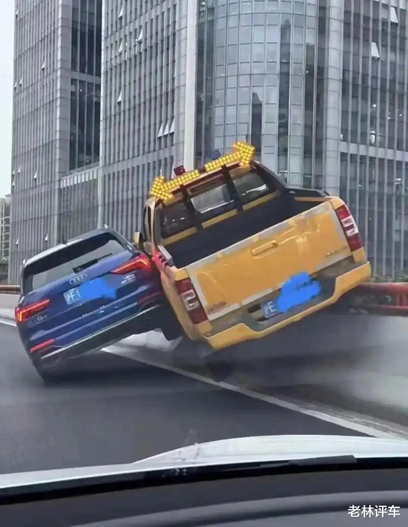 事情是这样的,奥迪Q3车主在高架上行驶,一辆皮卡车故意别车,还发生了剐蹭,皮卡车主却像没事的人一样,扬尘而去。奥迪Q3车主肯定不会无动于衷,一脚油门追上去,然后往右打方向,把皮卡别停了,而皮卡差一点掉下高架,幸亏前面有根路灯杆挡了一下,否则掉下去就危险了。可以说奥迪Q3一战成名,把皮卡逼到绝路,证明了这款车确实很“硬”。