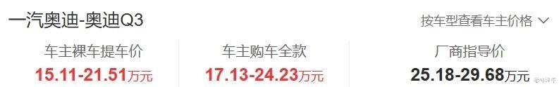 奥迪Q3售价25.18-29.68万元,车主提车价为15.11-21.51万元,标配车型的价格优惠了10.07万元,优惠力度还是很大的。