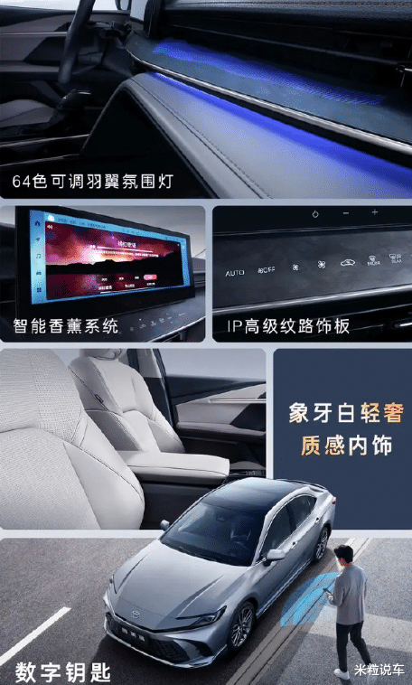 内饰设计其实是此次升级最大的亮点,首先是多出了数字钥匙,变得更像新能源汽车了。此外,还增加了64色可调节的豪华车内氛围灯,拥有智能香薰系统(这是低价格的丰田,你敢相信吗?)。更关键的是,在中控台上采用了纹路更加高级的装饰面板,全新米色内饰,所以档次感有了大幅度的升级。
