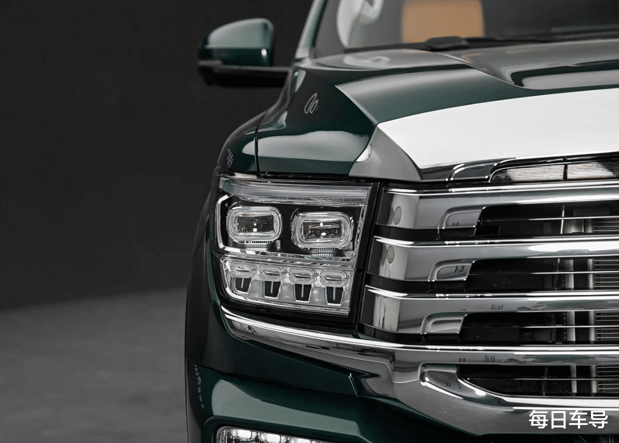 首先对于外观上的升级,这款车主要集中在前脸上,这款车的前格栅采用的是“举折”设计,灵感来自于中国古建筑坡屋顶,显得非常有层次。其次在大灯的设计上,带有矩阵式的风格也非常高级。而在车身侧面这款车秉承着的是饱满圆润的设计理念,后排还有专属的隐私玻璃。至于尾部的设计上,这款车悬挂式的备胎,依旧很有野性,而在尾灯方面,除了基础的示宽灯之外,它还有一个智驾的小蓝灯,整体来说这款车还是很霸气的。特别是新款车型新增的敦煌绿的配色,是满满的一种高级感。