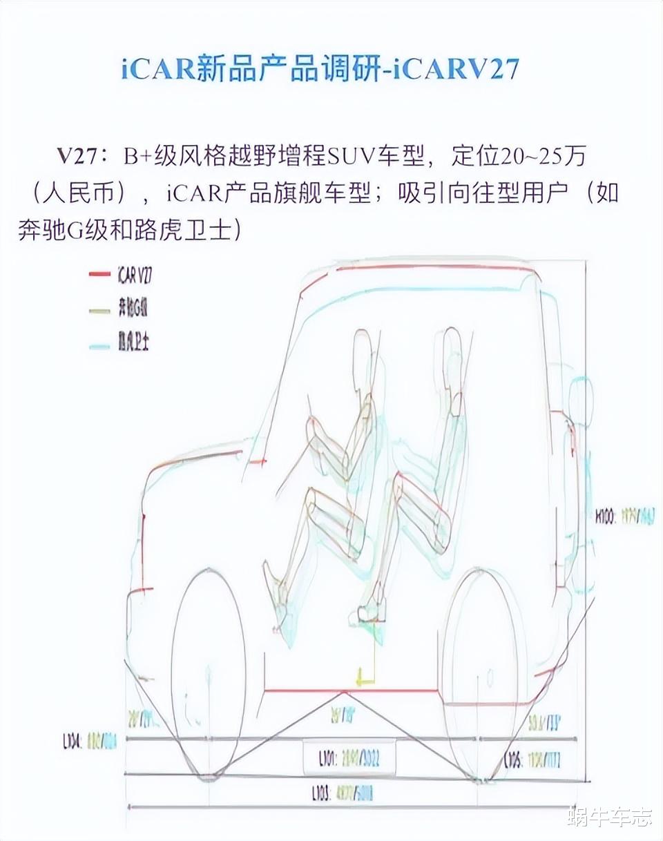 再来看一台国产“大G”,iCAR新车型--iCAR V27,是一台很有个性的中大型硬派SUV。据悉,它的车身尺寸将与奔驰G级接近,给组图秀下iCAR V27与奔驰大G的侧脸。不过iCAR V23车尾将没有全尺寸备胎,而是装配“小书包储物箱”,采用侧开式尾门。