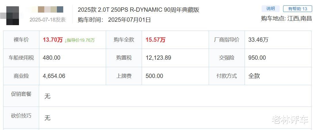 价格方面,我们获取了天津车主和南昌车主的提车价格,他们选择的都是2.0T 250PS R-DYNAMIC 90周年典藏版,该车售价33.46万元,天津车主优惠了19.46万元,裸车价为14万元,南昌车主优惠了19.76万元,裸车价为13.70万元。当然,我相信这样的价格肯定是包含了国补和省补的,要不然很难做到这样的价格。