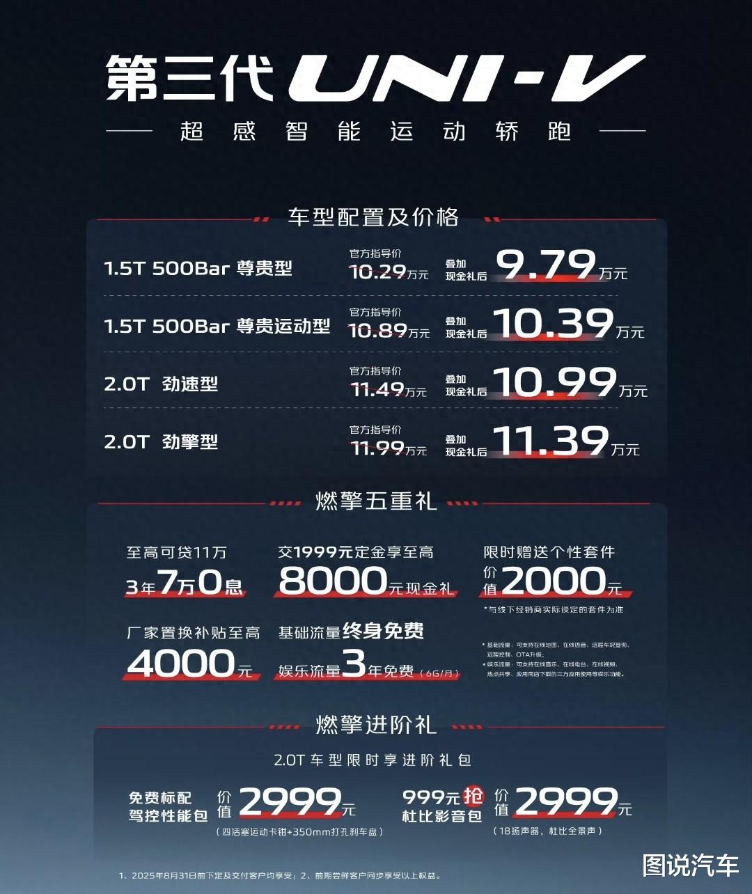 当然,我们说的是1.5T的入门版本,实际上在新款UNI-V内饰还有一些情绪价值上的设计,2.0T车型方向盘右下角的赛道模式按钮,一键进入赛道模式,这种设计对于一些年轻人而言,还是有值得玩味的地方,虽然即便站起来把油门踩进油箱零百也是6.3秒。