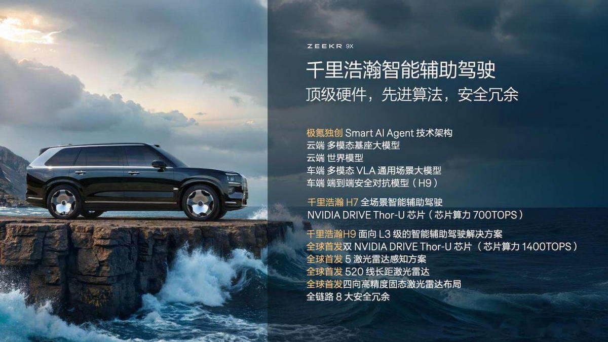 辅助驾驶方面,极氪9X的双英伟达Thor-U芯片能提供1400TOPS总算力,还有“1+4”的五激光雷达布局,在硬件层面其实已经足以支持L3级辅助驾驶了。按照官方的说法,除了什么高快城的领航辅助,它能准确识别300米以外的故障车辆等等,但真要说开进更加复杂的城市路段,可能还是需要让用户来回答其稳定与否。