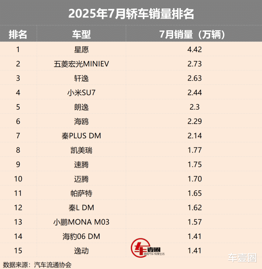 近日,汽车流通协会发布了2025年7月轿车市场销量。数据显示,7月轿车销量84.1万辆,同比增长6.4%。同时,7月轿车市场头部车型表现突出,自主与合资品牌各有亮点,市场竞争呈现多元态势。具体来看,星愿以显著优势稳居榜首,多款热门车型紧随其后,共同构成了7月轿车市场的竞争格局,让我们先睹为快吧。