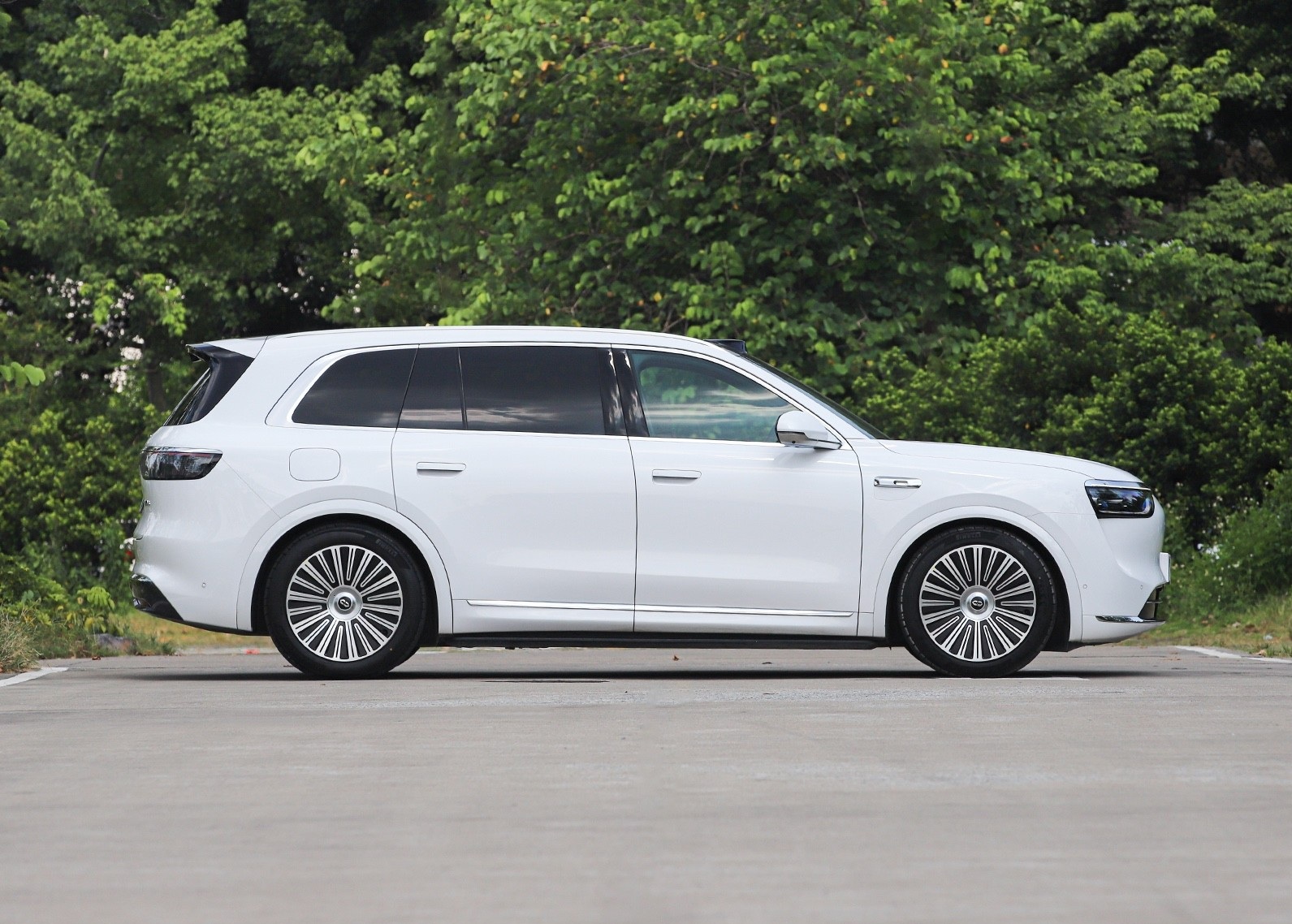 再来看新车的车身侧面部分,5190×1999×1795mm的庞大尺寸配合3105mm轴距,营造出媲美MPV的空间表现。侧面采用"星穹弧面"设计,隐藏式门把手与悬浮车顶形成流畅型面,可选21英寸玄曜运动轮毂(275/50 R20后轮)与电动迎宾踏板。同时,新车新增"夜紫"车漆采用纳米级珠光涂层,在光照下呈现紫金色渐变效果,搭配黑曜套件(选装价8000元)的熏黑饰条更显神秘气质。B柱位置嵌有NFC感应区,支持华为手机/手表无钥匙进入,全车电吸门闭合声噪控制在35分贝以内。