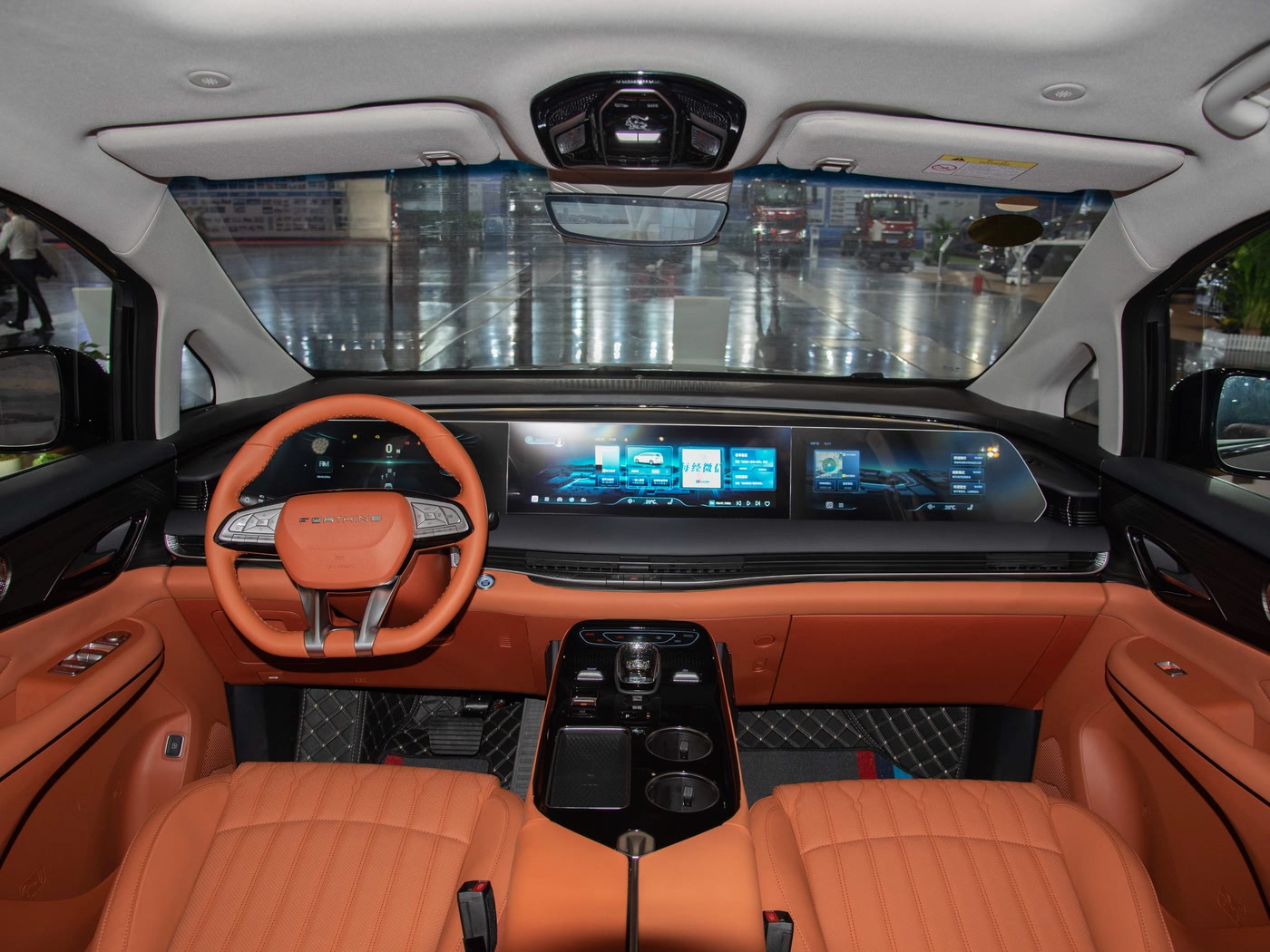 进入车内,新车内饰为黑棕双拼的配色设计,"山云涧"主题中控台,副仪表台呈现"一叶扁舟"造型,水波纹饰板贯穿驾驶区,同时新车还配备12.3英寸仪表+16.2英寸中控+12.3英寸副驾屏三联组合,科技感表现得很不错,同时新车还支持220V内外双放电功能(3.3kW外放电+座舱电源插座)满足露营办公需求,座椅方面,新车第二排航空座椅支持通风/加热/按摩,64色氛围灯可声光联动,长途乘坐舒适感表现出色。其他配置部分,2026款风行星海V9越享系列车型提供驾驶模式选择、360度全景影像、自适应远近光灯、电动尾门等配置。