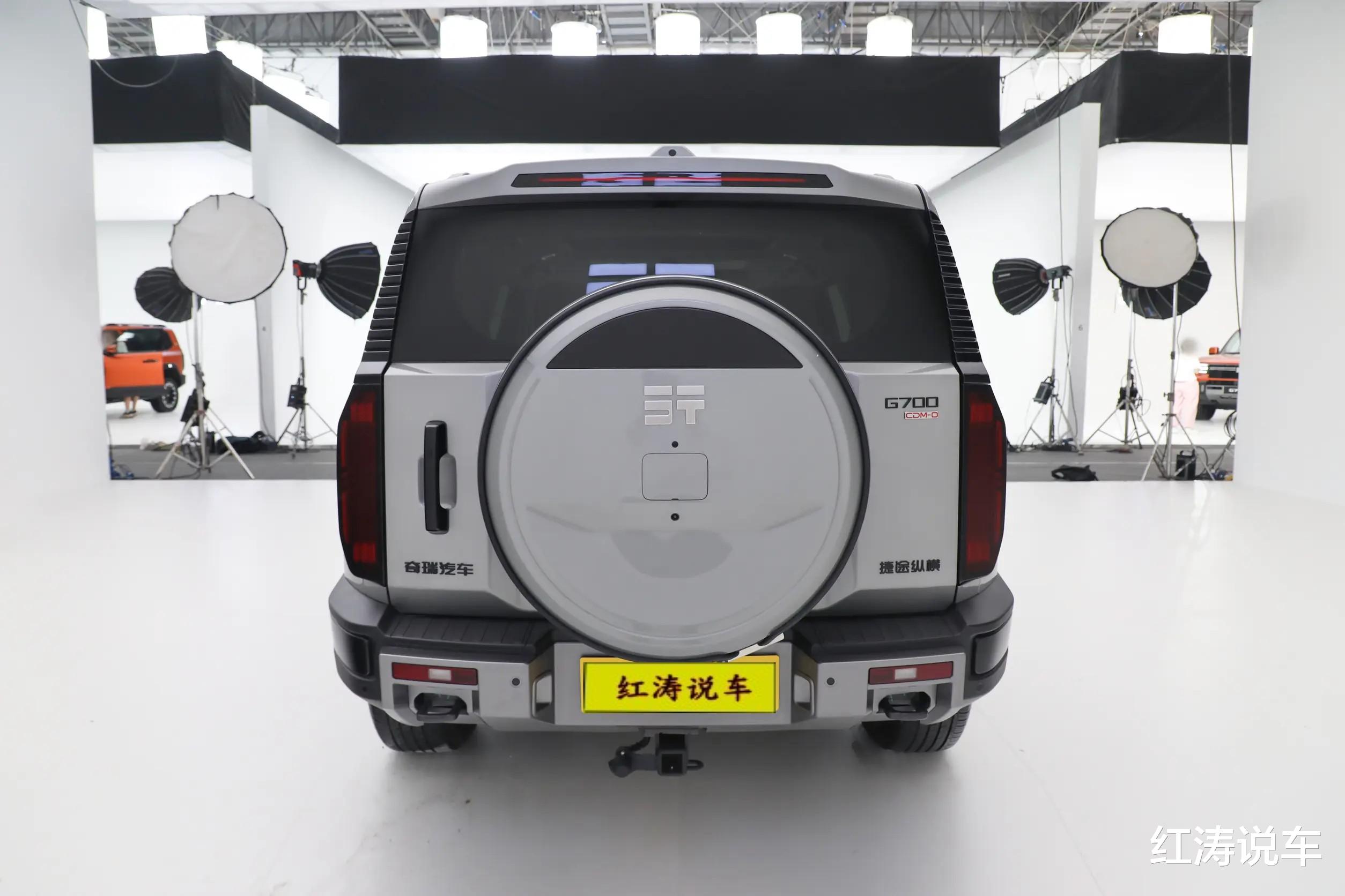 捷途纵横G700的车顶末端设计了横条状的高位刹车灯,尾部两侧设有纵向布局的熏黑尾灯,定制交互尾灯具备行车/驻车8种默认交互图案及3种自定义图案,采用侧开式尾门,具备电动吸合功能,后挂式备胎提供有备胎罩版本和无备胎罩版本,底部带有双侧外露式拖车钩和隐藏式排气。