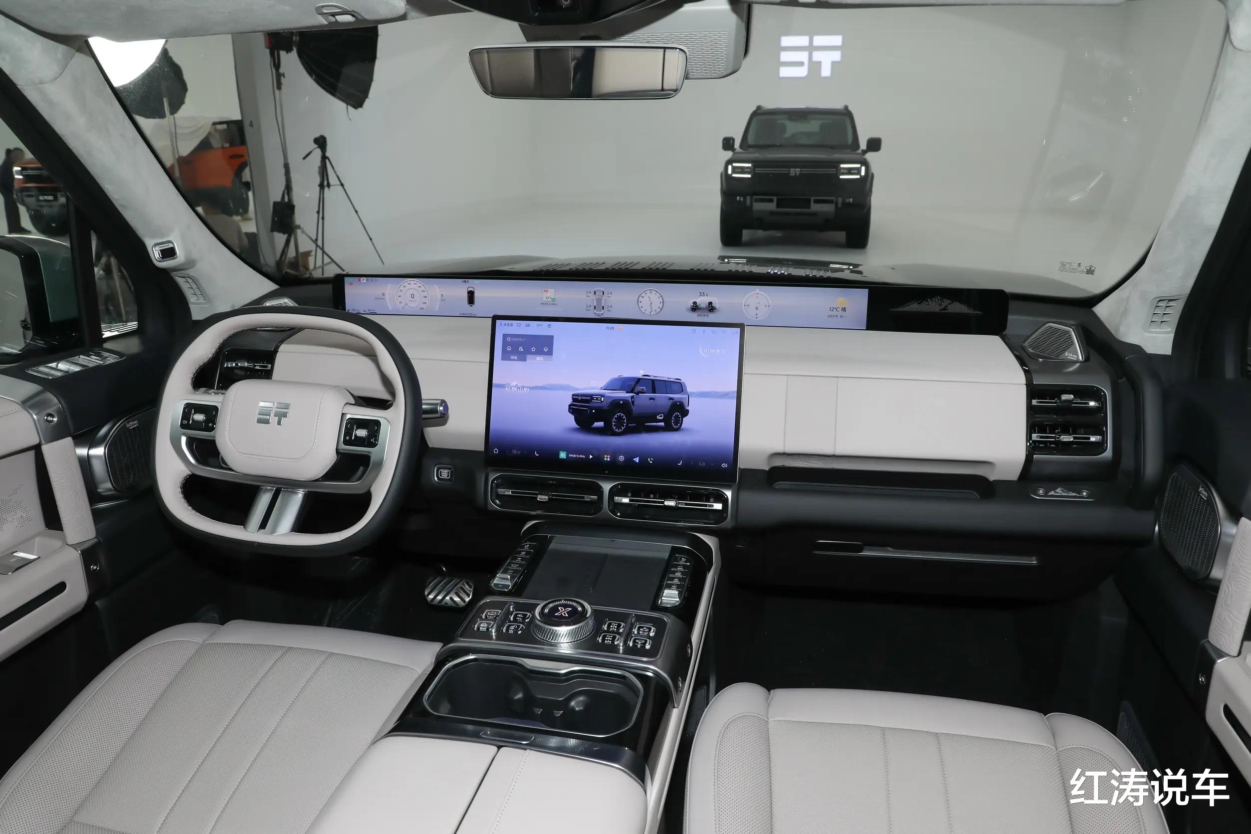 内饰方面,捷途纵横G700将硬派和科技元素相融合,副驾前方设计了开放式储物槽和公交车是扶手,采用电子怀挡机构,配备15.6英寸悬浮式中控屏,在中控台前端还带有一块35.4英寸贯穿式显示屏,可以显示车辆信息、多媒体功能、导航信息等。