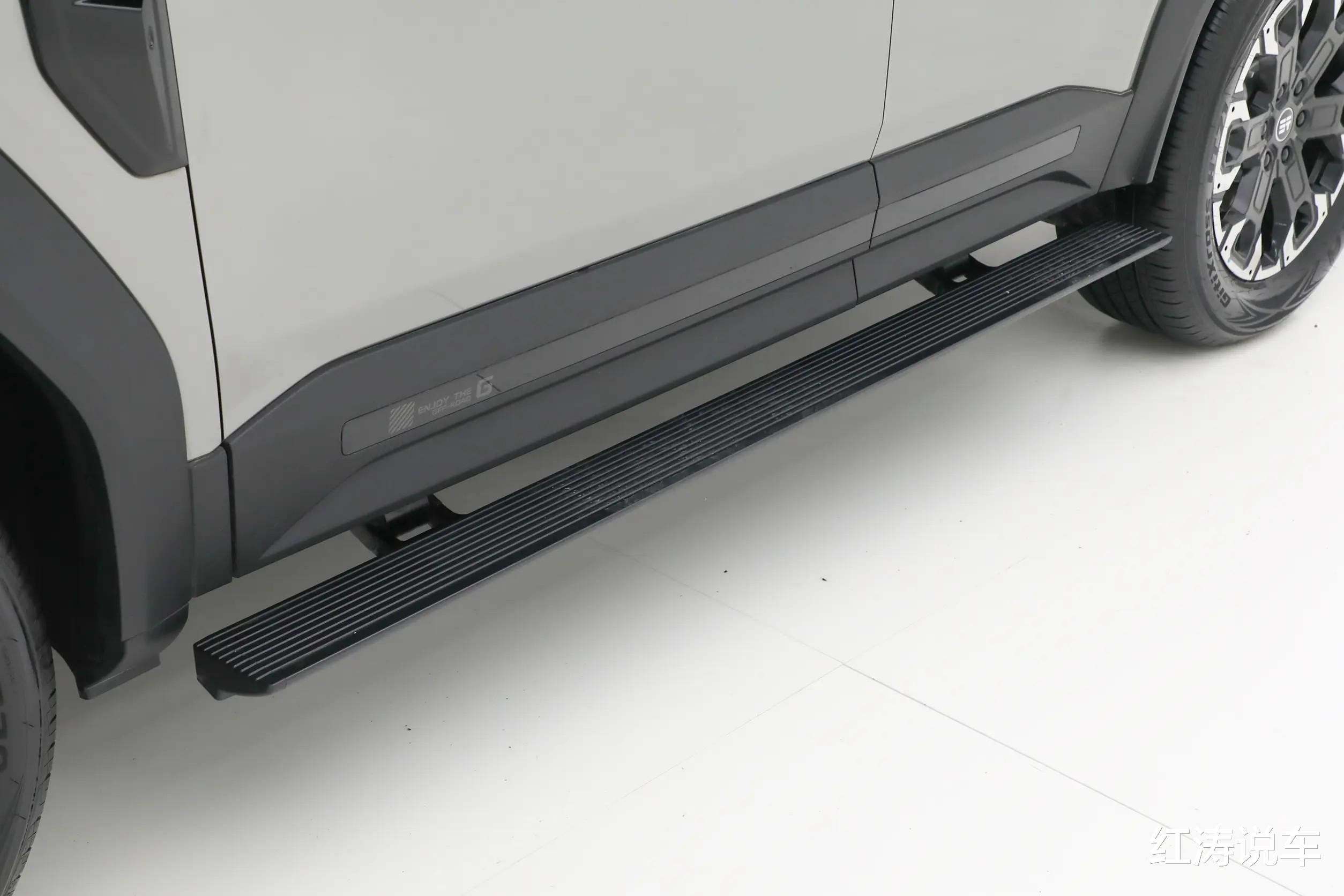 捷途纵横G700的A/B/C柱采用黑色涂装,配备车身同色外后视镜和传统造型车门外把手,车顶带有行李架,侧裙位置设有较大面积的防擦条,轮眉上方带有两点式轮眉灯,官方称A柱下端带有拓展接口,可拓展射灯,并且配备了电动侧踏板,D柱位置有着终身质保的铭牌。