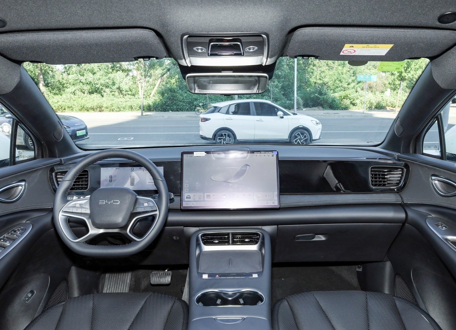 进入车内,新车采用了环抱式座舱以15.6英寸旋转屏为视觉中心,中控台波浪形饰板采用3D激光雕刻工艺。并且配备的10.25英寸全液晶仪表为嵌入式设计,还应用了15.6英寸悬浮式中控屏,搭载智能座舱高阶版-DiLink 100。该车配备四辐造型方向盘(浅色内饰方向盘使用双色皮质材料包覆),应用怀挡式换挡机构。副仪表台配有物理按键+滚轮、杯托等。灰黑双色麂皮面料座椅配备"海浪"缝线,靠背回弹率达66.7%。车辆后排带有空调出风口,后排座椅配备中央扶手,并支持4/6比例放倒。全系车型的前排座椅均支持电动调节(根据配置不同主驾座椅分为6向和8向电动调节)。