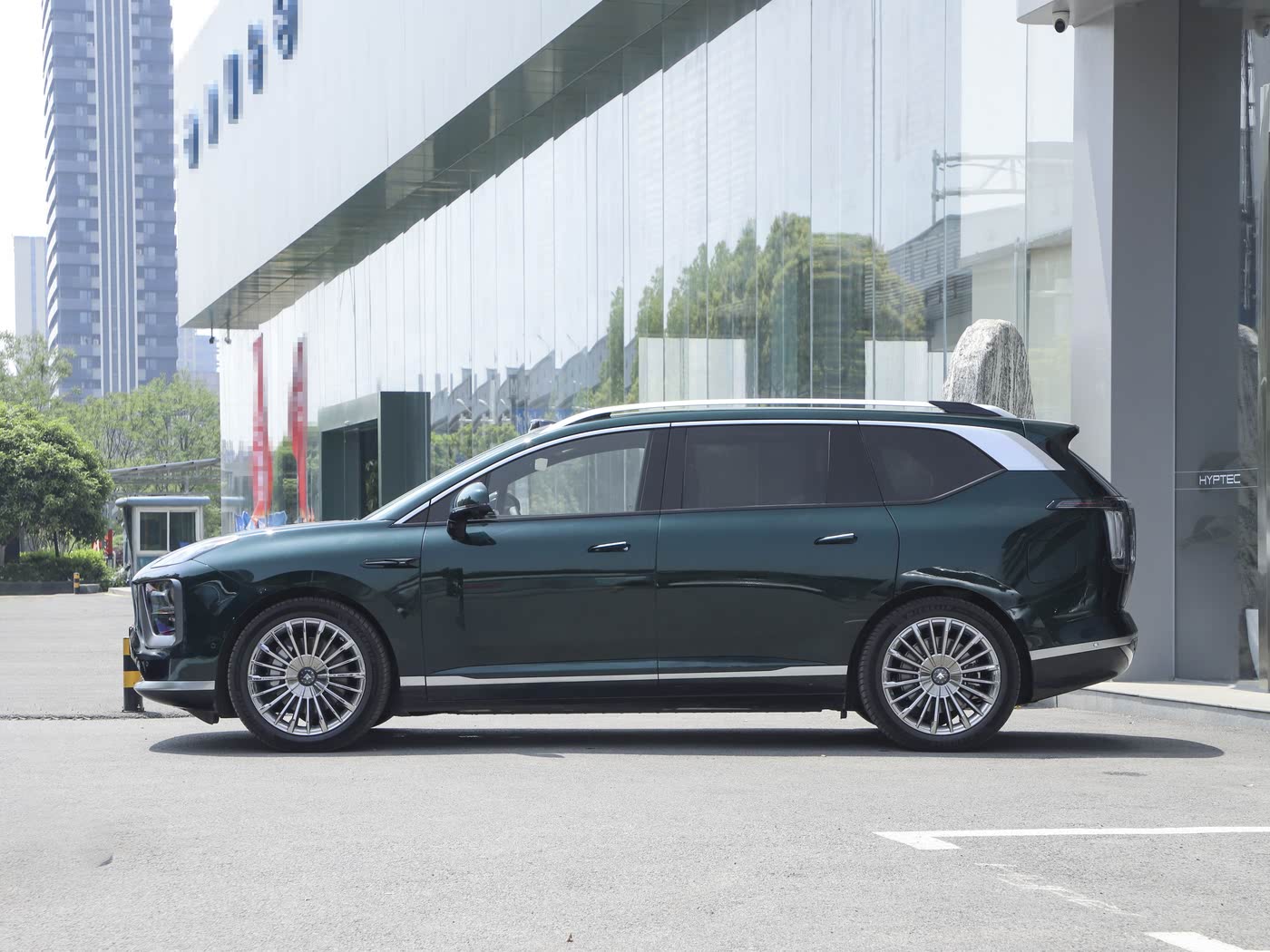 再来看新车的车身侧面部分,侧面采用分段式腰线设计,肌肉筋线与圆润曲面形成对比,搭配21英寸密辐轮毂(可选配米其林PS4 SUV轮胎),强化豪华运动属性。隐藏式门把手和银色D柱饰板降低风阻,同时提升科技感;3088mm轴距配合短后悬设计,使内部空间利用率最大化,6座版二排通道宽度达180mm,方便第三排进出。车身尺寸方面,昊铂HL增程版长宽高分别为5126/1990/1750毫米,轴距为3088毫米,与纯电版车型尺寸一致,定位于大型SUV,提供5座和6座车型。