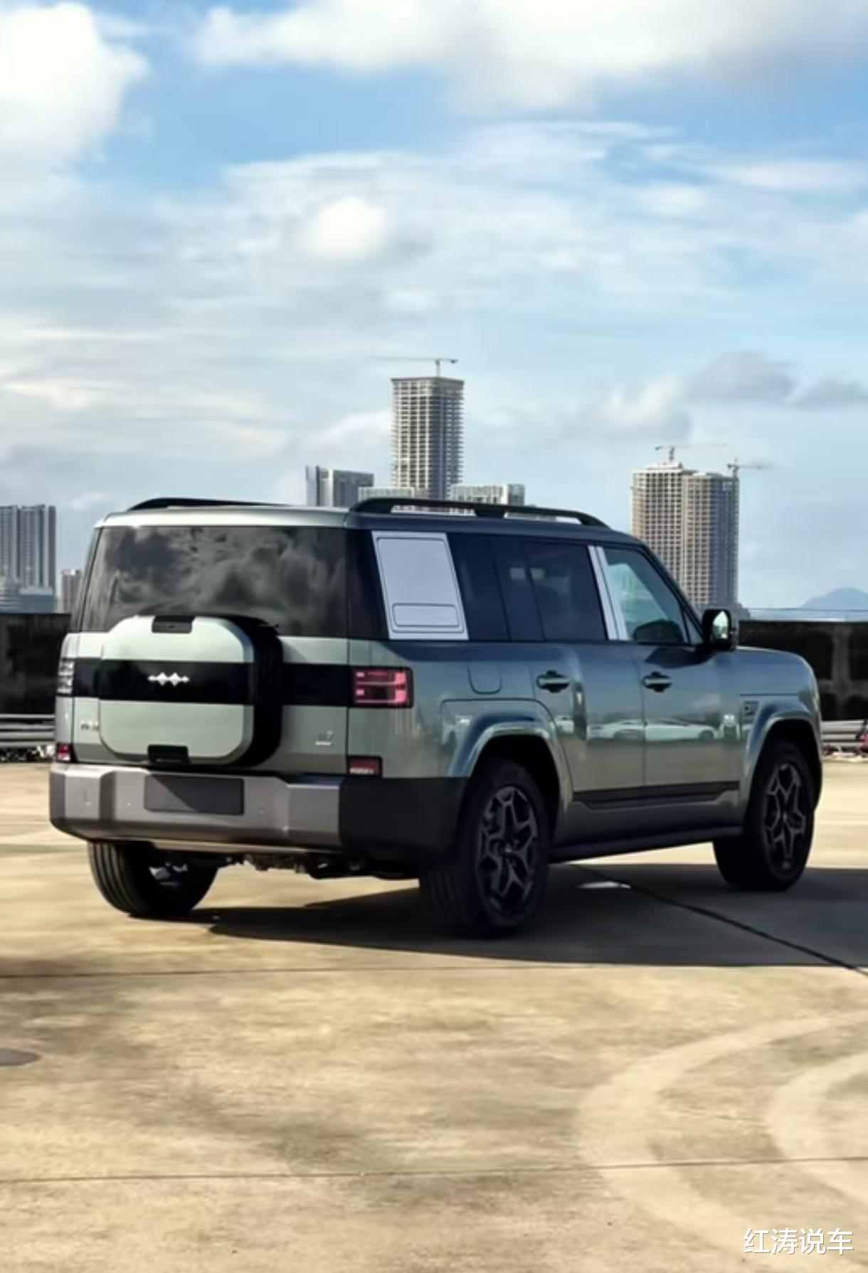 车身轮廓方正立体,展现出阳刚硬派之美,配备传统样式的门把手和固定式脚踏板,位于C柱和D柱之间的侧窗为半封闭处理,这点和路虎卫士130远征特别版的设计有些相似,尾部提供外挂式储物箱,电动吸合尾门提升了档次感,尾灯造型和前灯组做到了呼应。