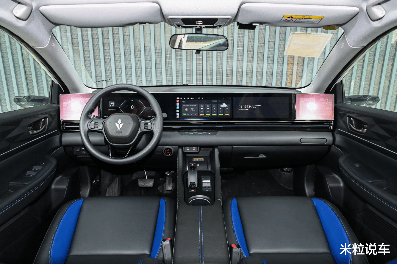 至于内饰设计,采用了5块贯穿样式大屏设计,其中两侧属于电子外后视镜版本,需要进行选装。除此之外,行车电脑,中控屏以及副驾驶娱乐屏幕一应俱全。虽然是一款新能源汽车,但是厂家也贴心地安排了机械挡把设计,这是用来模拟操控属性。此外,全景大天窗,双拼色的座椅也是一应俱全,亮点很多。