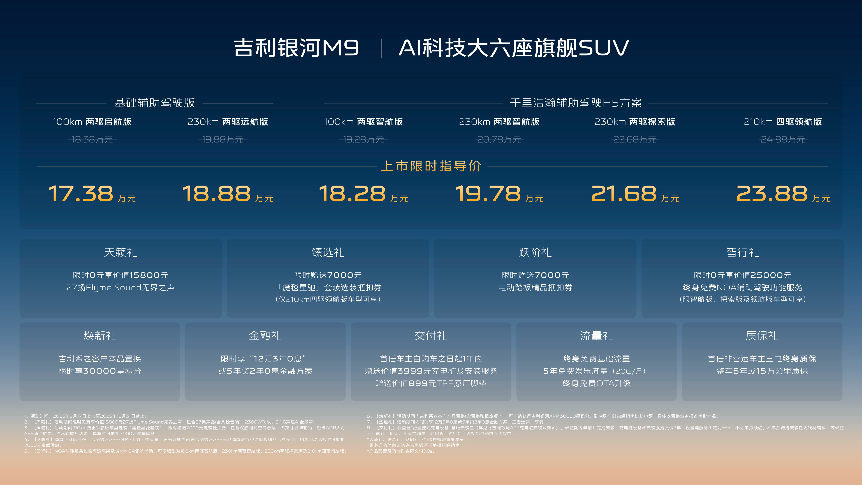吉利银河M9共推出6款配置车型,分别为210km四驱领航版、230km两驱探索版、230km两驱智航版、100km两驱智航版、以及230km两驱远航版、100km两驱启航版,叠加限时超级置换金10000元权益后,上市限时指导价为17.38万元-23.88万元。