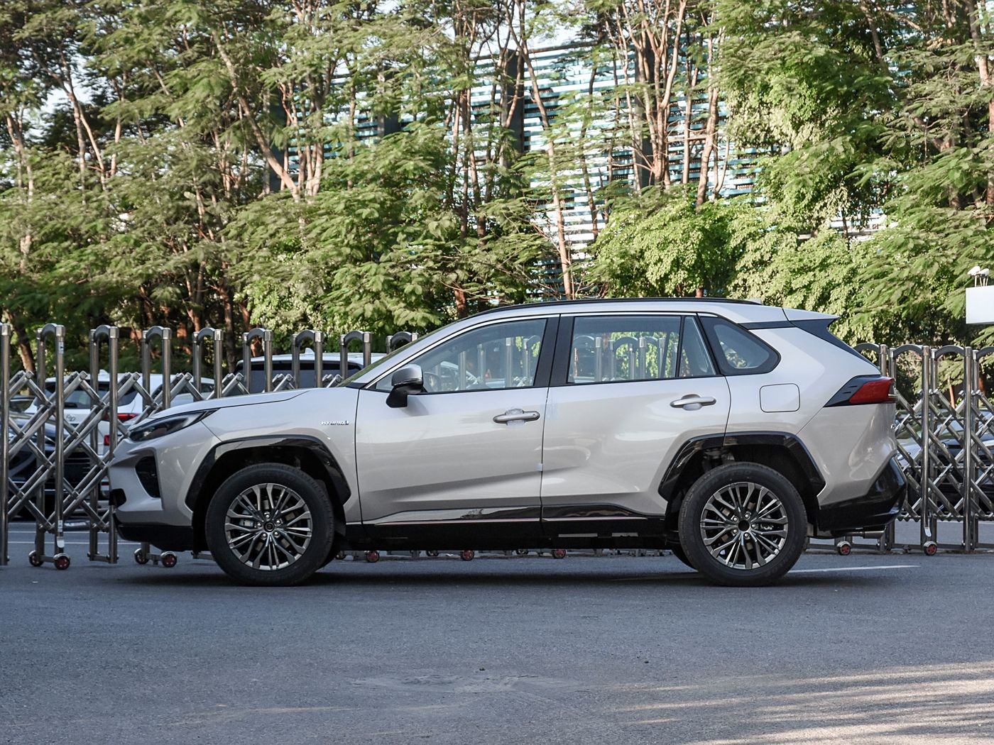 再来看车身侧面部分,丰田威兰达的侧面线条完美诠释了 “家用 SUV 的比例艺术”,4665×1855×1680mm 的三维尺寸搭配 2690mm 轴距,在视觉上营造出远超实际尺寸的魁梧感。一条从车头翼子板延伸至尾灯的腰线呈上扬趋势,在后门把手处形成明显折角,配合车门下方的内凹曲面,让车身侧面充满肌肉张力,这与 “兄弟车型” RAV4 荣放的设计精髓一脉相承。车顶线条从 B 柱开始平缓延伸,配合悬浮式车顶设计与镀铬行李架,既保证了头部空间,又强化了 SUV 的野性气质。车身色彩提供 7 种选择,其中 “欧泊银” 金属漆最为亮眼 —— 在不同光线下可呈现从银到灰的渐变效果,配合熏黑 B 柱与隐私玻璃,家用氛围中透着一丝运动感。