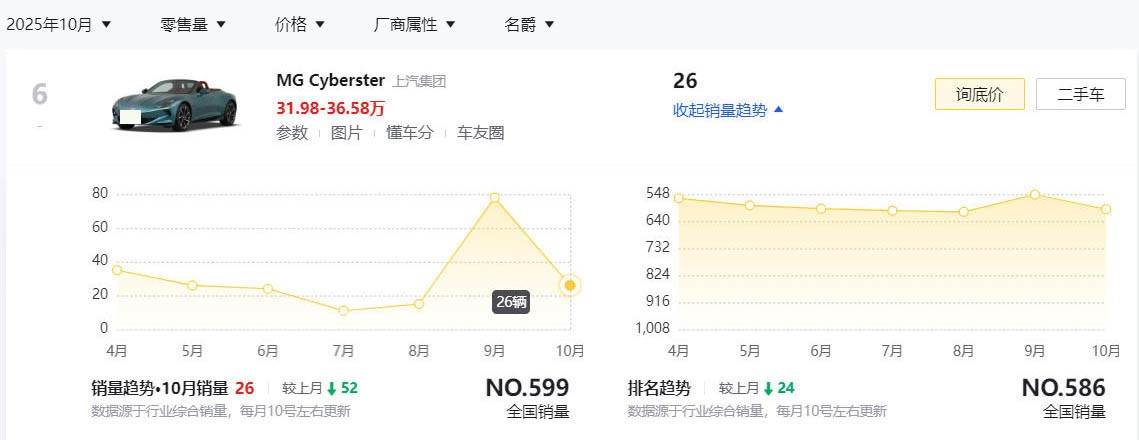 很多朋友可能都没有注意到,纯电敞篷跑车MG Cyberster居然在10月份仅卖了26台新车。要知道,这车刚上市那会关注度还是挺高的,但没想到现在销量却这么差,那具体的问题出在哪呢?