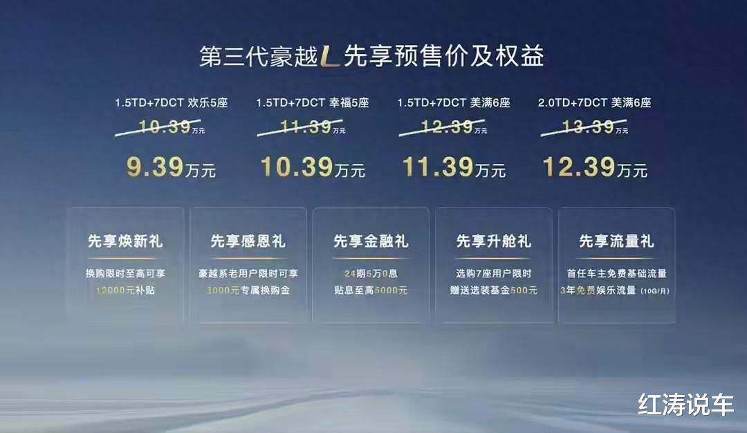 吉利豪越L是一款中型SUV,指导价格区间为12.79万元-15.39万元,就在11月22日,吉利汽车在2025广州车展上宣布,新款豪越L(官方称为第三代豪越L)正式开启预售,预售指导价10.39万元-13.39万元,先享预售价9.39万-12.39万元,新车的外观和内饰细节做出了改动,提供5座、6座和7座车型,继续搭载2.0T发动机,还新增了1.5T动力。新款豪越L拿出了诚意!不到10万元买中型SUV,能否让你心动呢?