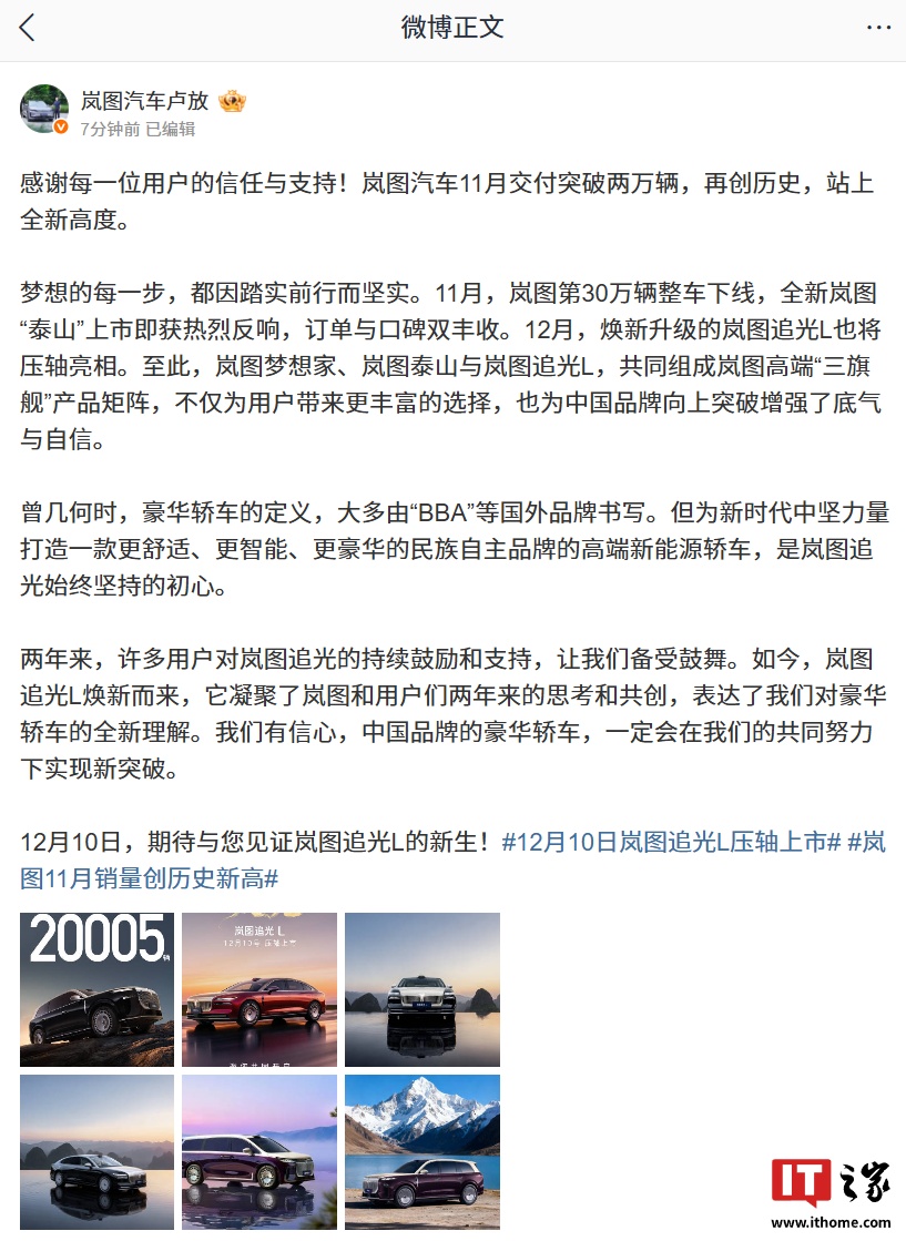 IT之家12月1日消息,岚图汽车科技股份有限公司董事长、总经理卢放今日宣布:岚图汽车11月交付突破两万辆,再创历史,站上全新高度。