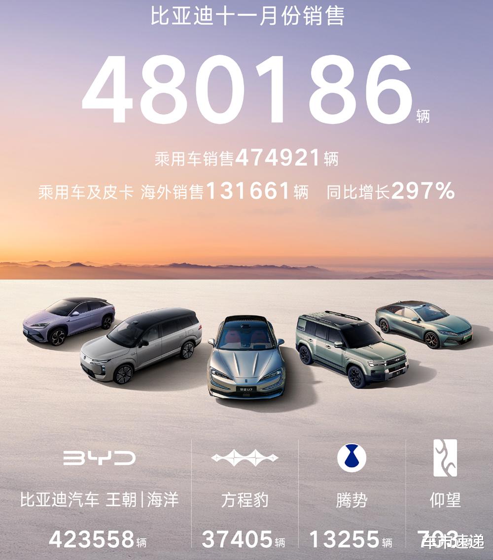 根据比亚迪公开的销售数据显示,在刚刚过去的11月份,比亚迪单月销量达到了480186台,创下了年内单月销量新高度,其中,乘用车及皮卡海外销售131661台,同比增长297%,创下历史新高。2025年1-11月比亚迪累计销量4182038台,其中,海外出口916764台。