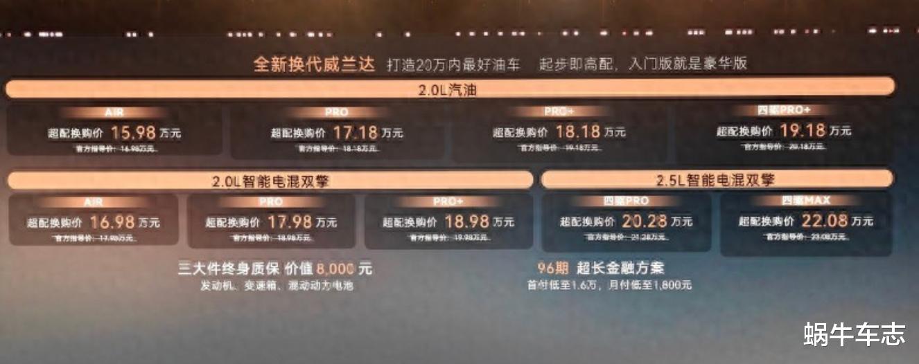 不过,我们可以简单看看门槛。首先,两款车的最低入手价,都是16.98万;而最便宜的四驱入手价,也就是2.0升自吸四驱入门版,威兰达要20.18万;而RAV4荣放只要18.98万。