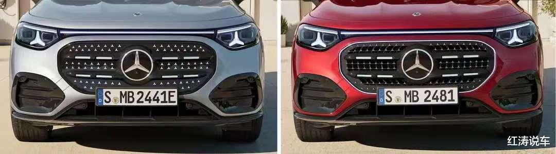 外观方面,全新奔驰GLB燃油版和纯电版的设计基本一致,仅细节处理略有不同。贯穿式LED灯带与左右熏黑大灯相连,日间行车灯使用了三叉星辉元素,前脸采用多边形格栅,硕大的三叉星辉镜面车标很醒目,而燃油版的中网为开放式格栅,内部由镀铬三叉星辉进行点缀,纯电版的格栅中网为封闭式造型,由黑色面板和多个可发光三叉星辉点阵灯珠构成。