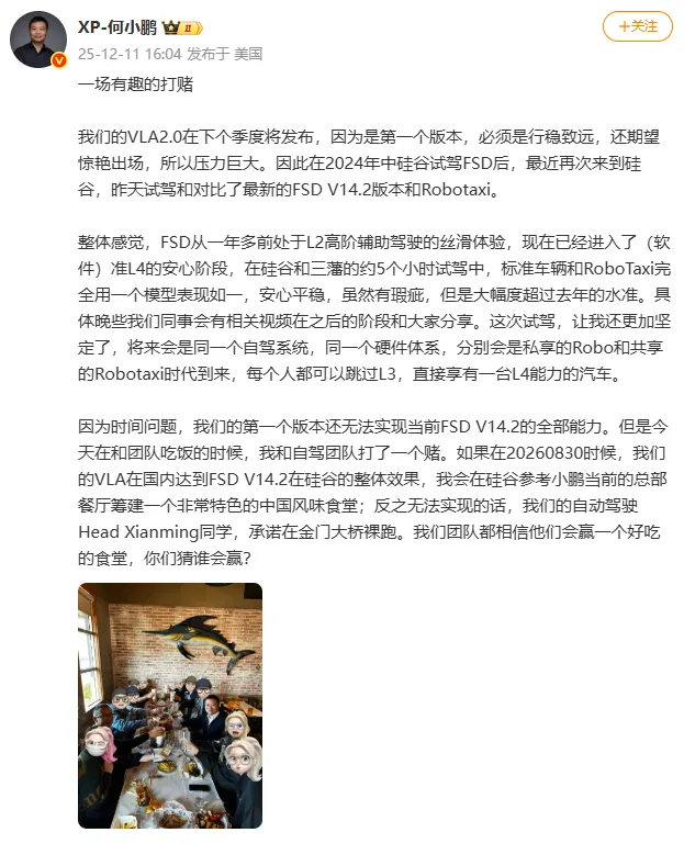 因为时间问题,我们的第一个版本还无法实现当前FSDV14.2的全部能力。但是今天在和团队吃饭的时候,我和自驾团队打了一个赌。如果在20260830时候,我们的VLA在国内达到FSDV14.2在硅谷的整体效果,我会在硅谷参考小鹏当前的总部餐厅筹建一个非常特色的中国风味食堂;反之无法实现的话,我们的自动驾驶HeadXianming同学,承诺在金门大桥裸跑。我们团队都相信他们会赢一个好吃的食堂,你们猜谁会赢?
