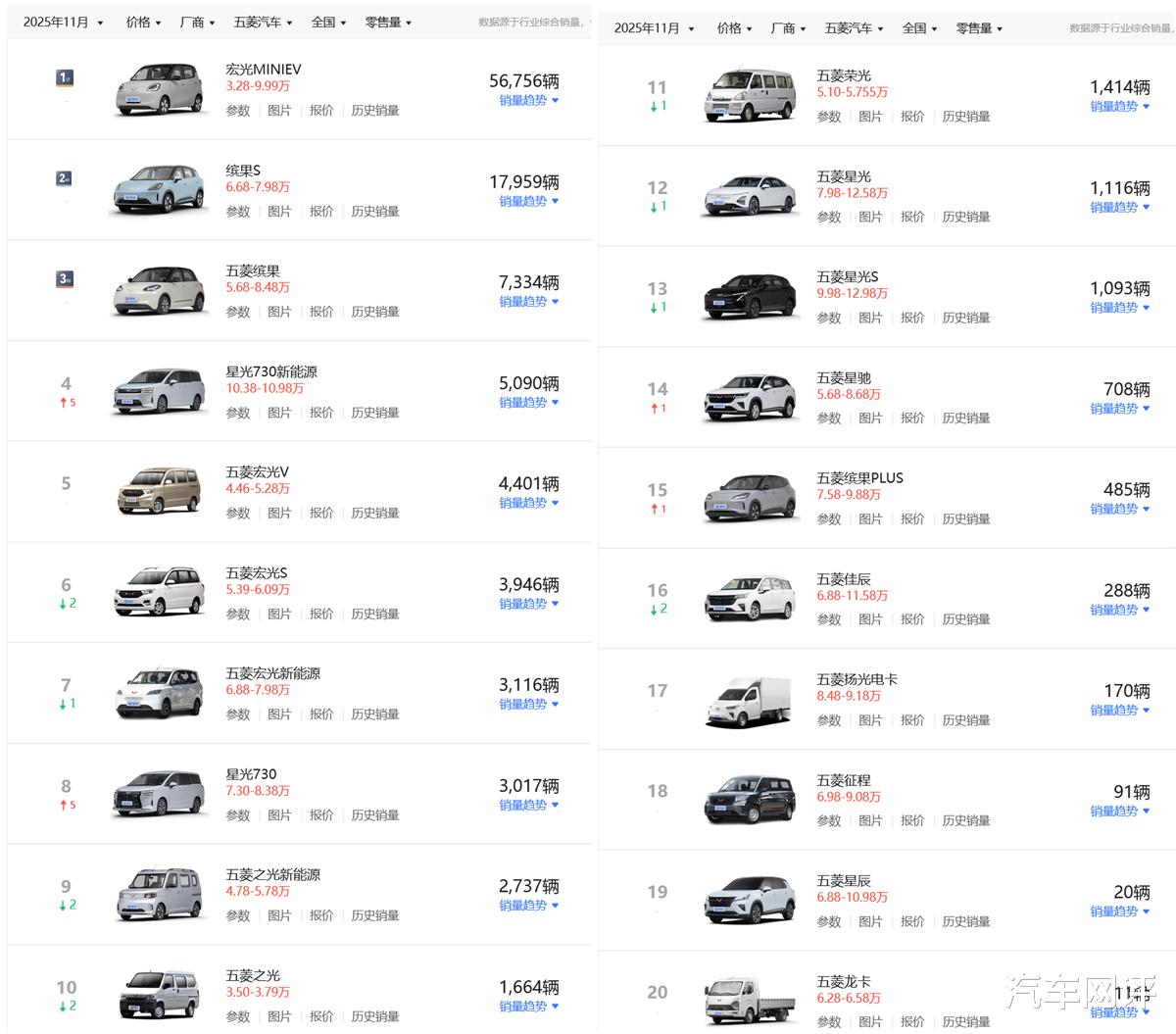 深入来看,五菱的销量结构呈现出明显的“支柱依赖”特征。具体到车型,五菱宏光MINIEV在11月份单月销售56756辆,依旧是销量基石;缤果S贡献了17959辆;而上市不久的五菱星光730(涵盖燃油、插混与纯电版本)则取得了10351辆的成绩。三款车型合计销量达到85066辆,在总零售量中占比超过80%。换句话说,五菱绝大部分的销量重量,几乎都压在了宏光MINIEV这一根“主梁”上。