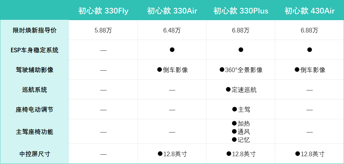 有一说一,纳米01的产品力确实不赖,那这么多车型,咱们该如何选择呢?纳米01全系分为两大类型,一是初心款,包括330Fly、330Air、330Plus、430Air车型,这几款车型,其实就主打实用,可以满足基础出行。至于续航,大家就按需选择即可,城市出行为主,就选330KM的车型,偶尔会跨城通勤,就选430KM的车型。需要区分的就是330Plus、430Air车型,前者具备主驾加热、通风、记忆功能,且带有360°全景影像和透明底盘,品质更高,后者就是续航更长,但配置稍低,就看大家是选择用车品质,还是注重续航。