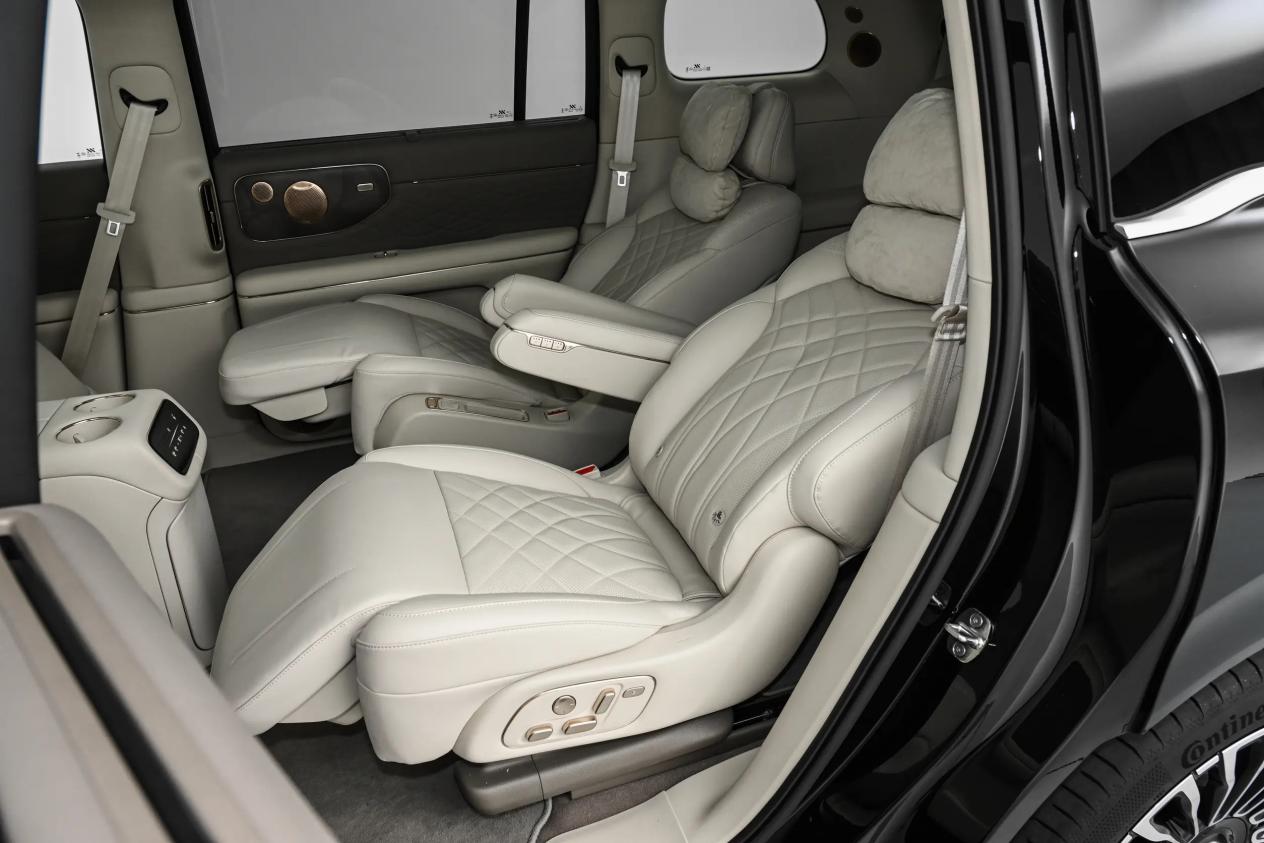 智己LS9定位全尺寸大六座SUV,车长5279毫米、宽2000毫米、高1806毫米,标准大型SUV深踩,轴距3160毫米。车内采用三排六座布局,得房率达到了86%,第二排两个独立座椅标配电动调节、加热、通风与4D机械按摩功能。在“四人舒享模式”下,第二排座椅可以调节至接近半躺的角度,腿部空间能达到1207毫米,膝部空间265毫米,提供类似MPV的乘坐体验。车内配备副驾和二排一共三个零重力座椅,支持一键舒享零重力模式,减少长途乘坐的疲劳感。