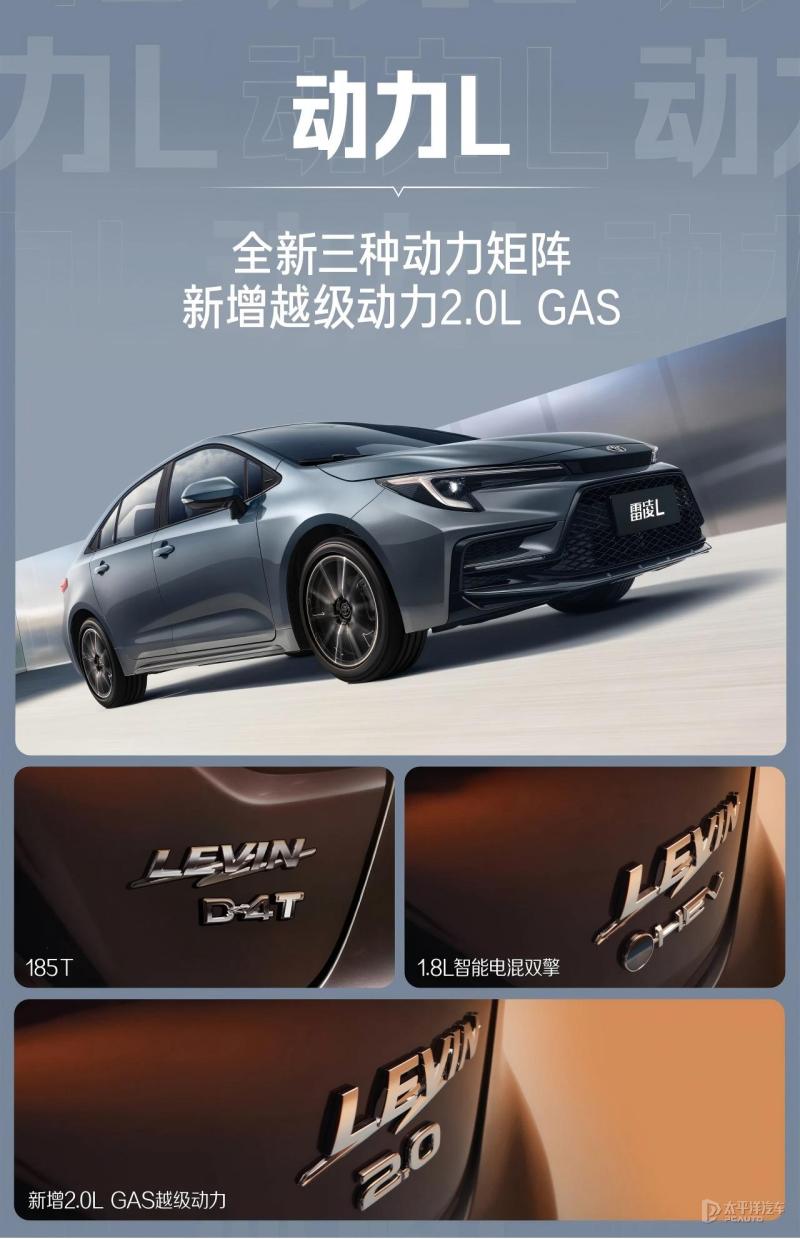 动力方面,雷凌L提供三种动力选择,1.2T涡轮增压发动机最大功率116马力(85千瓦),最大扭矩185牛·米;1.8L油电混动系统综合功率为101千瓦。