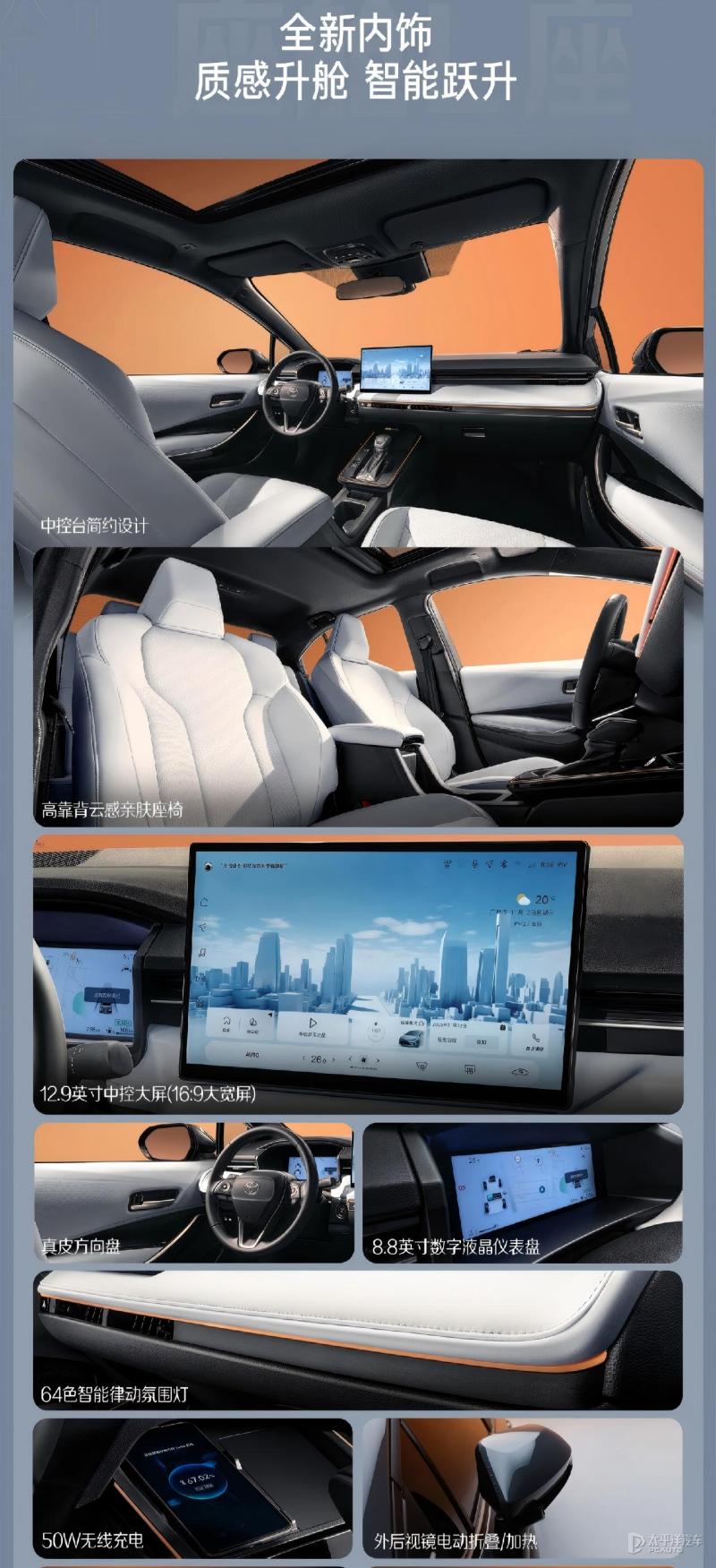 内饰方面,雷凌L进行了全面革新,采用全新的黑白配色设计,空调出风口为贯穿式样式,并引入了64色律动氛围灯提升车内质感。搭载8.8英寸数字液晶仪表盘和12.9英寸中控屏,并配备高通8155P车规级芯片。