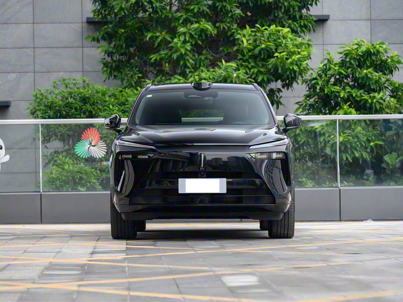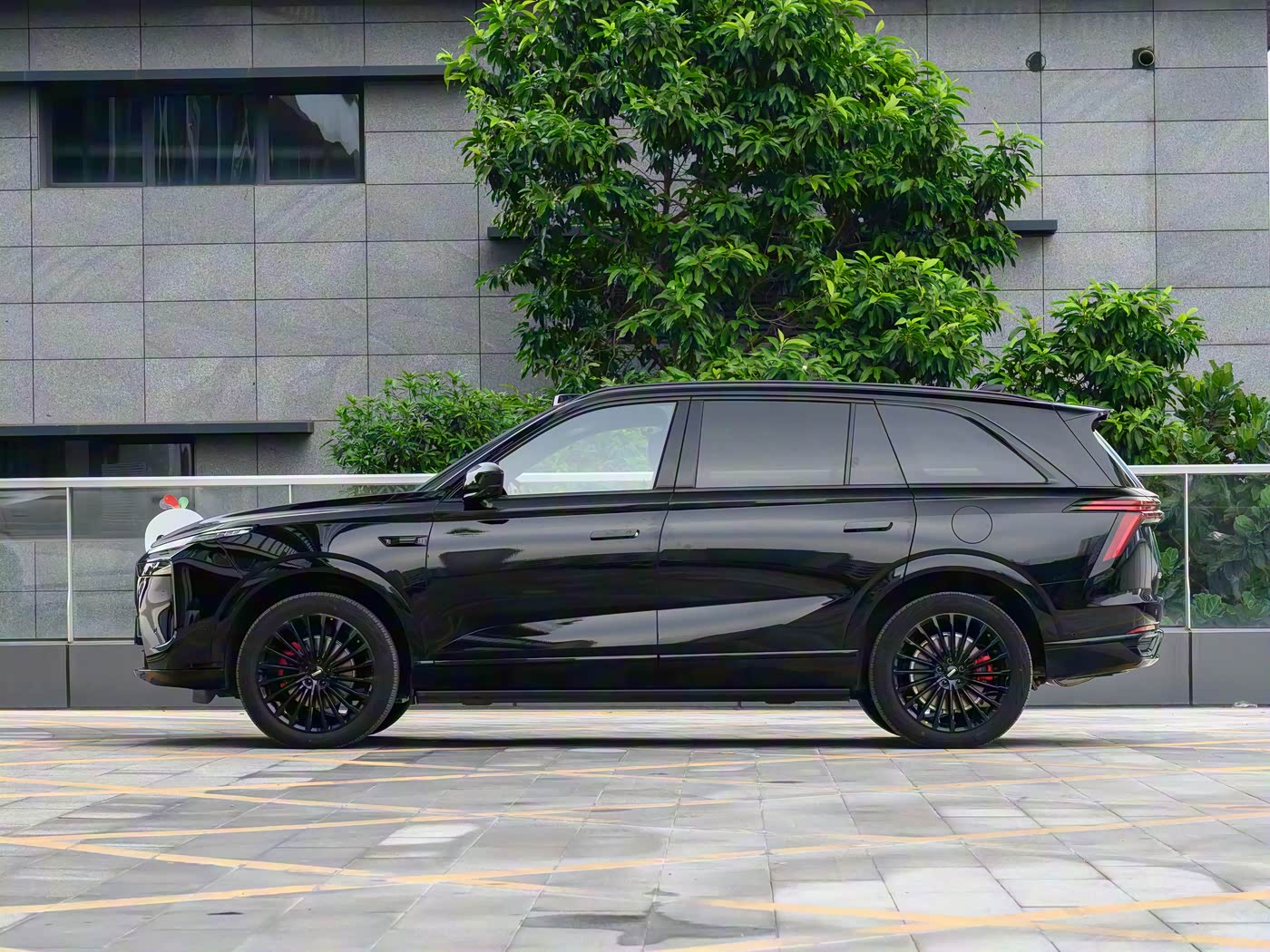 再来看车身侧面部分,车身尺寸达5156×1980×1805mm,轴距3050mm,为六座布局提供充裕空间。上下双腰线设计增强立体感,隐藏式电动门把手降低风阻系数。21英寸多辐熏黑轮毂搭配红色刹车卡钳,彰显性能基因。电动脚踏板具备防夹功能,下沉5厘米方便乘客上下车,关闭后与车身齐平优化空气动力学。