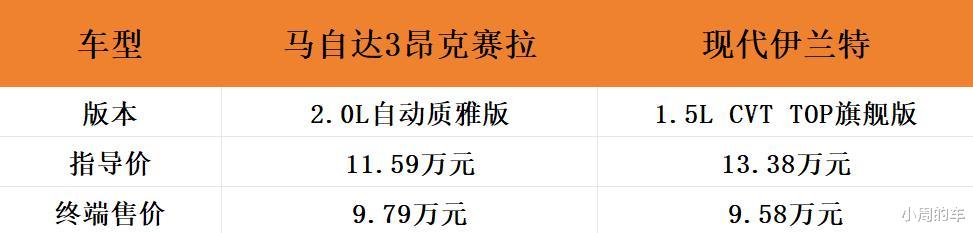 两款车型分别是马自达3昂克赛拉和现代伊兰特,卡着10万元的预算,我们选取到的是马自达3昂克赛拉 2.0L自动质雅版(以下简称马自达3昂克赛拉)以及现代伊兰特 1.5L CVT TOP旗舰版,两台车的官方指导价格分别是11.59万元和13.38万元,目前在终端市场售价均已经来到了10万元以下,接下来我们就从多方面来对比下,家用怎么选更合适?