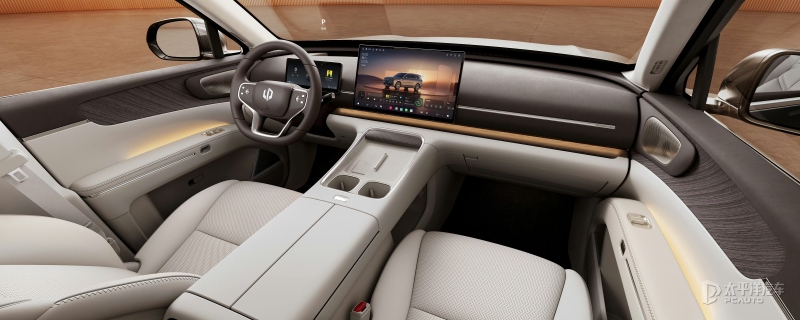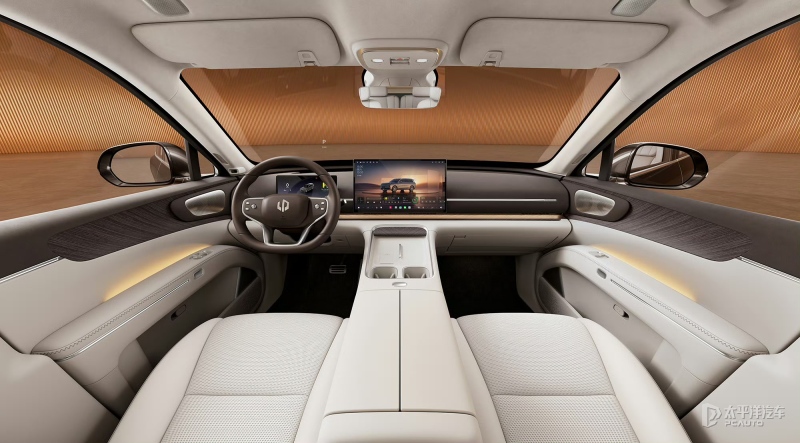 从发布的内饰官图来看,零跑D19延续了家族式布局设计,整体风格非常简约,车内物理实体按键非常少,空调出风口为隐藏式布局,加上采用双拼配色,以及在氛围灯的烘托下,豪华感十分明显,相比零跑其他车型明显更有质感。在布局方面,采用了10.25英寸液晶仪表和17.3英寸中控屏组合,搭配60英寸AR-HUD抬头显示,配有三幅式多功能方向盘,应用电子换挡式换挡。