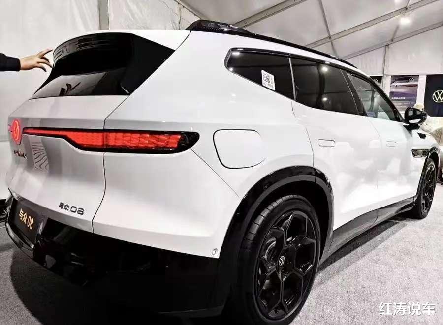与众08的尾部宽大厚重,车顶末端配有扰流板和长条形的高位刹车灯,可点亮的大众车标两侧有着狭长的灯组,和车头设计做到了呼应,尾门左侧有“大众汽车”,右侧有“与众08”标识,表明其身份,亮黑色后包围面积比较大。